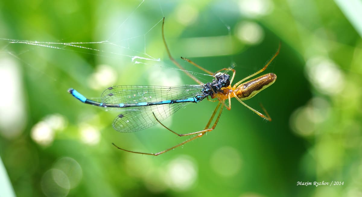 И в заключение, кто-то из пауков-тетрагнатид (Tetragnatha), скорее всего - тетрагината горная (Tetragnatha montana) вкушает голубую стрелку (Enallagma cyathigerum). Эти пауки, плохо различаются между собой, хотя у каждого вида, свой рисунок на брюшке. Их можно часто встретить во влажных местах, по берегам водоемов.