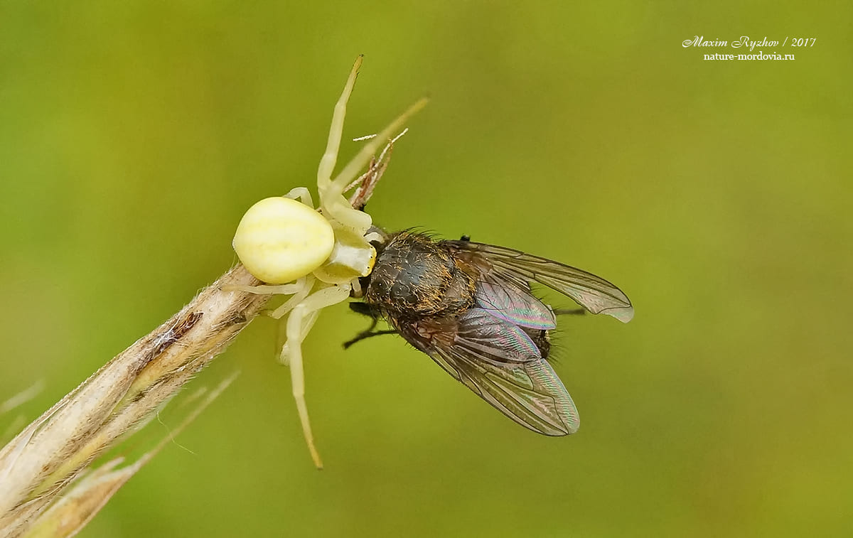 Самый наиболее часто встречающийся сюжет подобных фотографий - паук на кончике травинке, с мухой в хилицерах. Причем, что удивительно, здесь он муху держит спереди, а на остальных фотографиях - за брюшко.